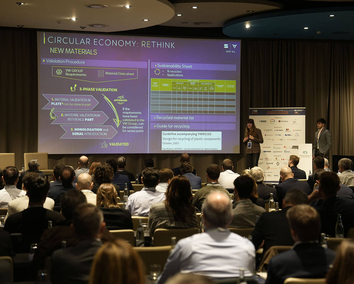 Otro OEM participante fue SEAT, encargado de abrir el segundo día del evento. Angela Herranz, Sustainable Polymers, Coating & Body Int. Analyst de SEAT, explicó la estrategia circular de materiales de la compañía, con la reciclabilidad y la incorporación de contenido reciclado como pilares en cuanto a tecnología de materiales. Entre otras iniciativas para avanzar en sostenibilidad, destaca un proyecto de diseño para la circularidad de un apoyabrazos basado en un concepto monomaterial, presentado por Gianmarco Sabellico, PhD Student en SEAT.